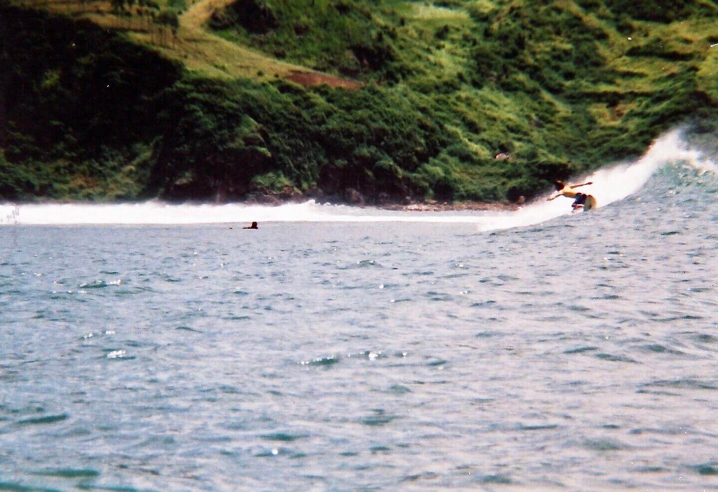 ローカルガイドのアテンドの元一番良い波を、ピークから押してもらい乗って行きます。